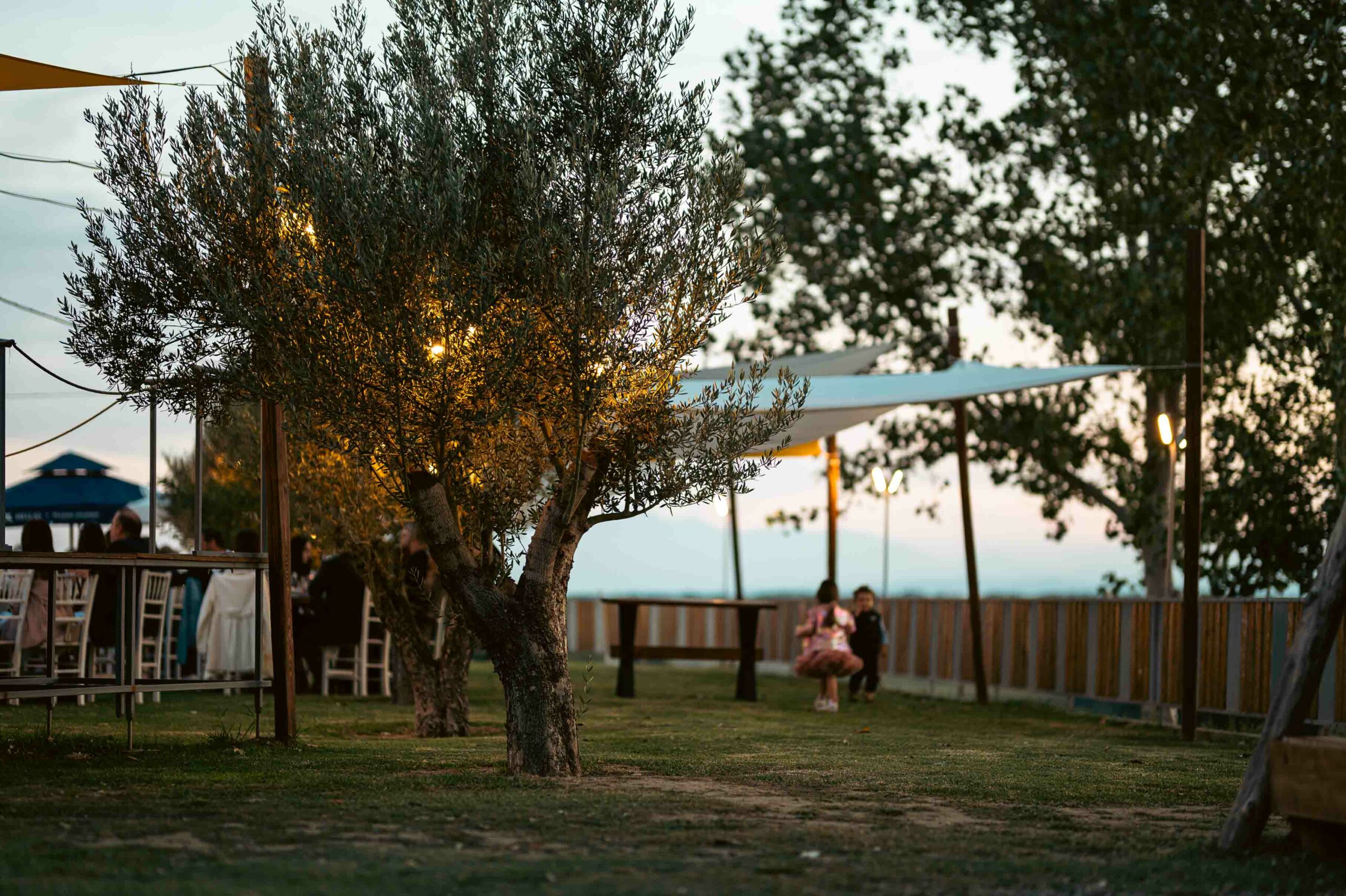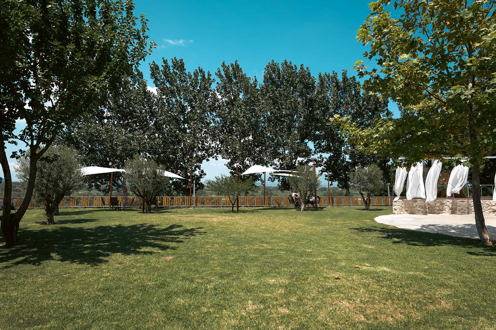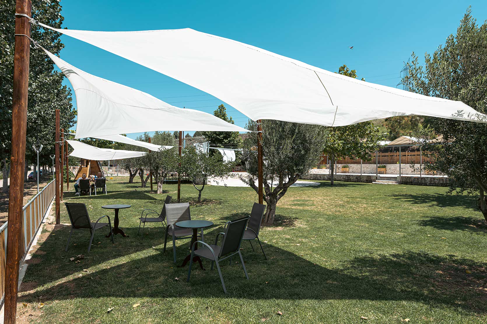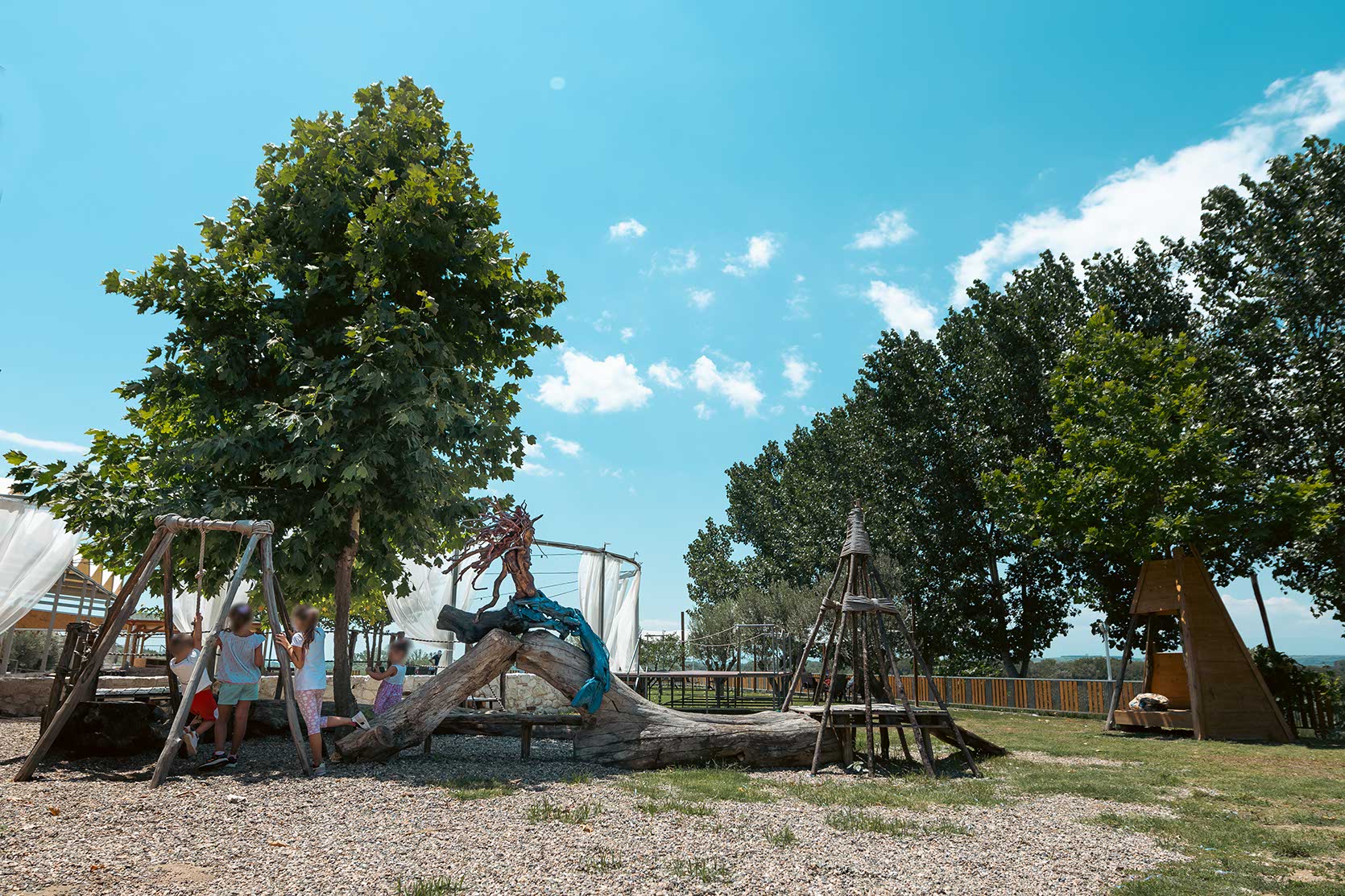 Ένας πλήρως open space χώρος 60 στρ., με απευθείας οπτική επαφή στα παραποτάμια δάση και στις νησίδες του Αξιού Ποταμού, όπου συγκεντρώνονται άγρια άλογα και μια από τις μεγαλύτερες μεικτές αποικίες πουλιών στην Ελλάδα, χαρίζει στους επισκέπτες του ένα απίστευτο ηλιοβασίλεμα.